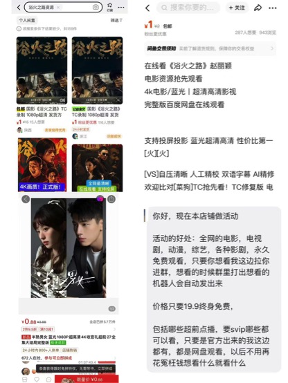 国庆档电影《浴火之路》《志愿军:存亡之战》仍在院线上映,第一财经记者发现,这些电影的网盘链接已经开始在闲鱼等电商平台售卖,店家标有“4K电影、蓝光”字样,价格在1元~3元之间。此外,记者打开网页搜索发现,不少盗版网站已经可以提供电影全片的免费观看。