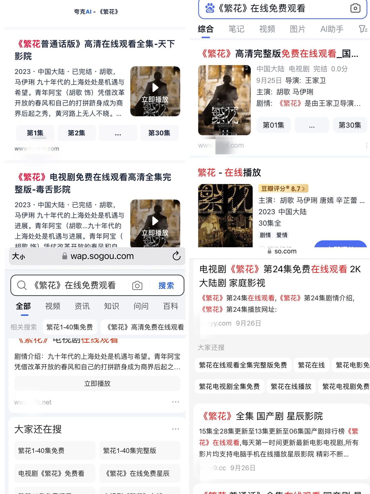 第一财经记者在夸克搜索中输入腾讯视频的爆款剧集《繁花》,前3条结果中有2条为侵权网站,点击进入该网站相关剧集视频,页面显示有赌博广告信息,用户还可以购买夸克网盘SVIP获得更高质量的画质和音效。当记者在包括百度、搜狗、360搜索等在内的多家搜索平台输入“《繁花》在线观看”后,搜索结果的第一页均显示有盗版视频网站,有些盗版侵权网站的搜索结果显示顺序甚至排在正版链接的前面。