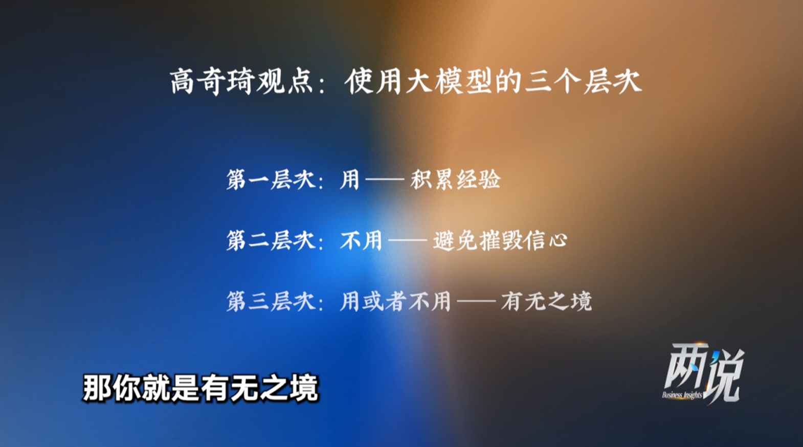 人工智能逐渐嵌入到我们生活中,正确认知和使用才能发挥它的作用。全国高校纷纷开设AI通识课,贾开向复旦大学国际关系与公共事务学院教授高奇琦问到:“学生用了AI后,还愿意思考吗?”高奇琦提出,如果人工智能仅仅是用来完成作业就会很糟糕。随后他将人工智能的使用总结为三个层次。先“用”以积累经验,然后 “不用”以重建信心,最终达到“用与不用”的有无之境。