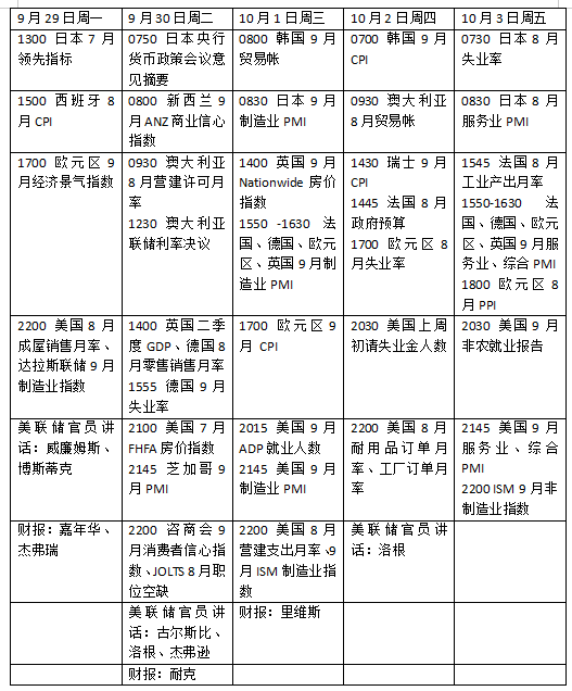 本周看点颇多,投资者将重点关注美国就业数据,若出现任何疲软迹象,都可能重新点燃未来数月内美联储启动一系列降息的预期。欧元区9月初步通胀数据即将发布,或影响年内宽松前景;澳大利亚联储料按兵不动。此外,美国国会需在10月1日截止日期前通过政府拨款法案,若未能就此达成共识,美国联邦政府将面临停摆。欧美经济体9月服务业采购经理人指数(PMI)终值将反映经济强度。